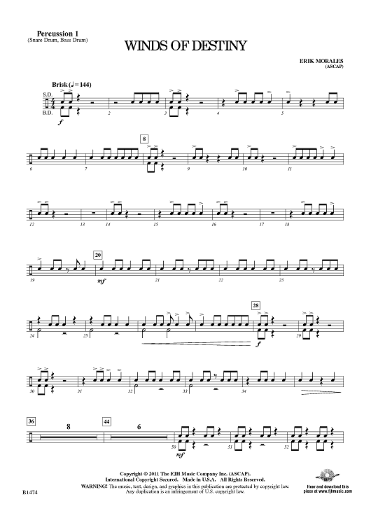 Digital Sheet Music for Winds of Destiny - Percussion 1 by Erik Morales scored for Concert Band; id:425783