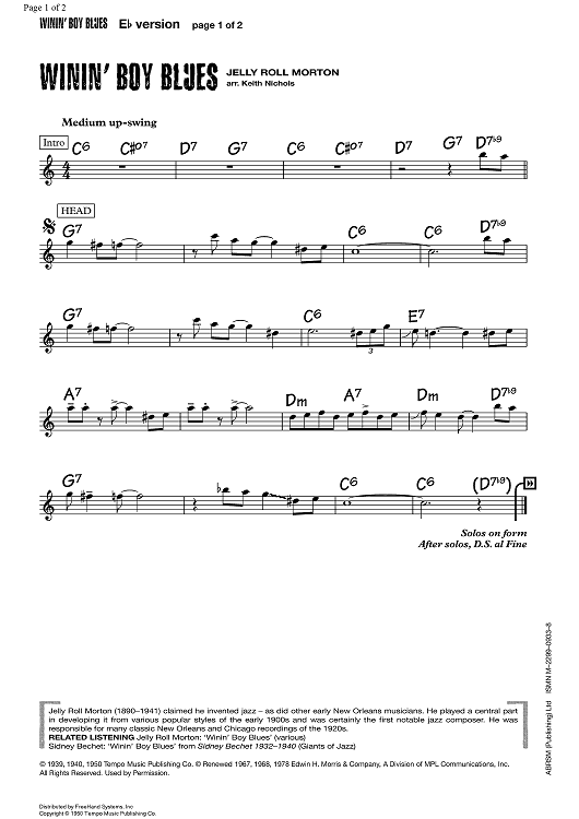 Digital Sheet Music for Winin' Boy Blues by , Keith Nichols, Jelly Roll Morton scored for E-flat Lead Sheet; id:355589