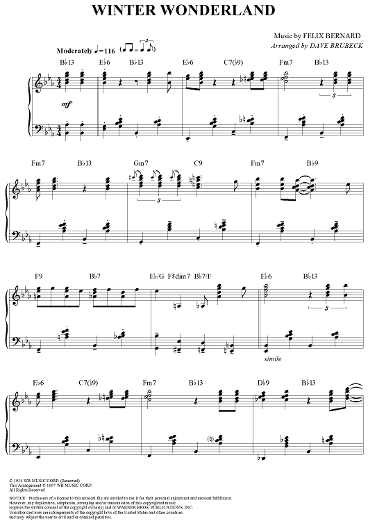Digital Sheet Music for Winter Wonderland by Felix Bernard, Dave Brubeck scored for Piano Solo; id:275268