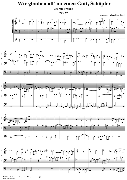 Digital Sheet Music for Wir glauben all' an einen Gott, Schöpfer (Chorale Prelude, BWV 765) by Johann Sebastian Bach scored for Organ Solo; id:241421