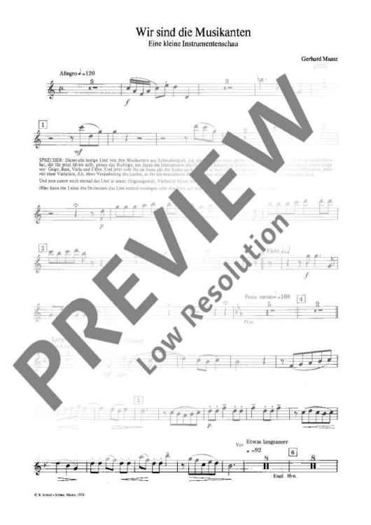 Gerhard Maasz studied composition with Paul Graener and sympathized with the youth music movement around Fritz Jöde. In the „kleine Instrumentenschau“ created in 1977 he uses the popular folk song „Wir sind die Musikanten“ (which can be joined in by a one-part chorus) introducing systematically the individual orchestral ins-tru-ments. A work for children’s and school concerts allowing the players and listeners an insight into the structure of an orchestra in a cheerful way.