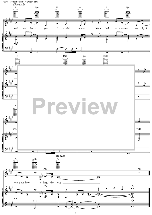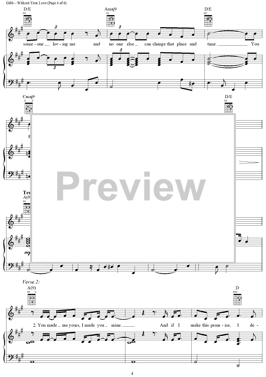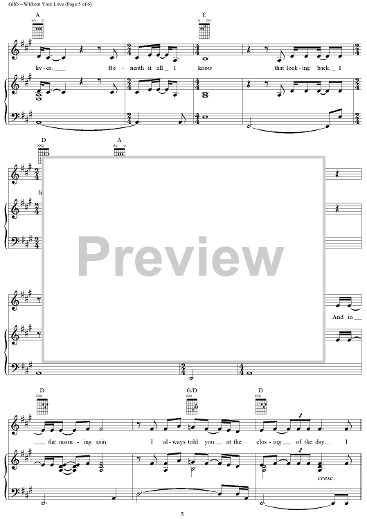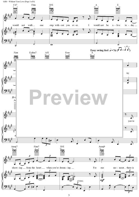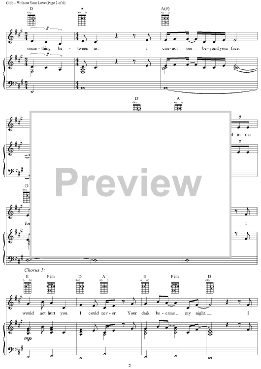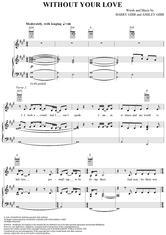 Digital Sheet Music for Without Your Love by Barry Gibb, Ashley Gibb, Barbra Streisand scored for Piano/Vocal/Chords; id:318186