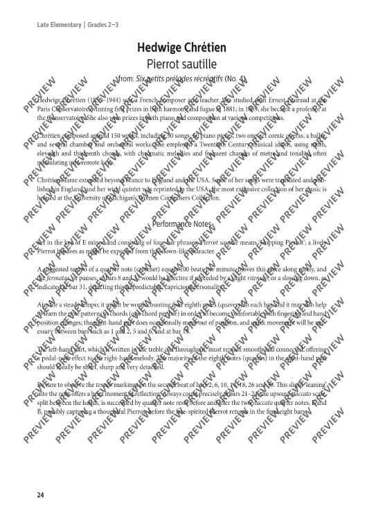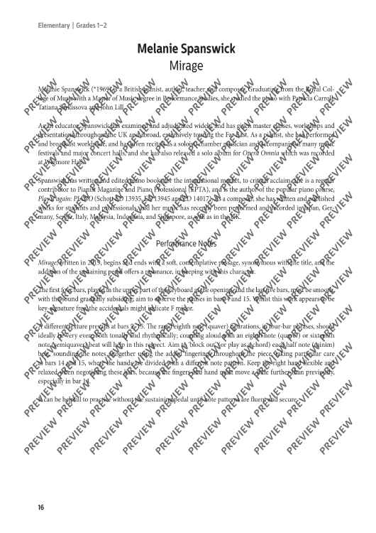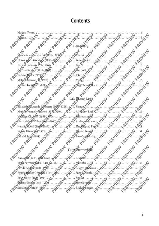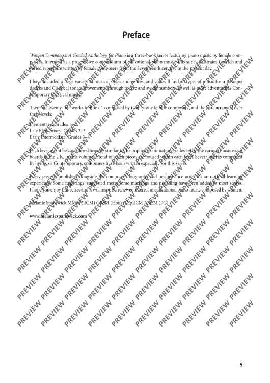 This three-volume series of piano music by women composers is a progressive compendium of educational literature with a broad repertoire from the 17th century to the present day. For each piece, the editor has written short instructions with rehearsal tips as well as biographical notes on the women composers. The collection covers all levels of difficulty from easy (volume 1) to medium (volume 2) to difficult (volume 3) and is an indispensable addition to lessons and concerts. WOMEN COMPOSERS: A GRADED ANTHOLOGY FOR PIANO - Press Reviews “…Melanie Spanswick must be congratulated on her extensive research in uncovering exiting music to enthral pianists and teachers.” Piano Professional “An extremely useful and stimulating collection.” International Piano “…these are well-presented books that succeed in offering some belated recognition to neglected composers and their music.” Pianist Magazine "Melanie Spanswick’s Women Composers: A Graded Anthology is utterly superb, and will surely be of significant interest to pianists everywhere.” Pianodao.com “Melanie Spanswick's anthology is not only representative, but also inspiring.” Piano Bulletin "This series is an incredible and much-needed collection of over fifty works by over fifty female composers. ...Melanie Spanswick has done an exceptional job of collating these works into graded anthologies." The Piano Teacher