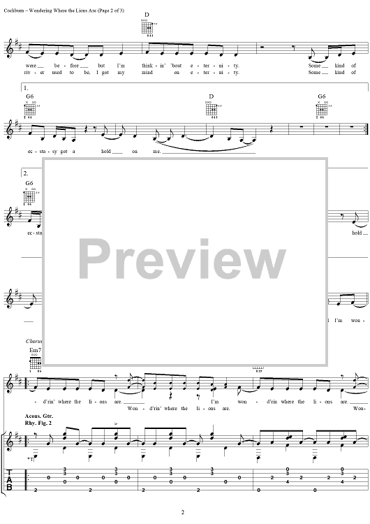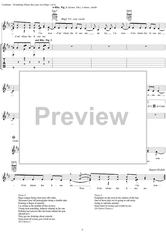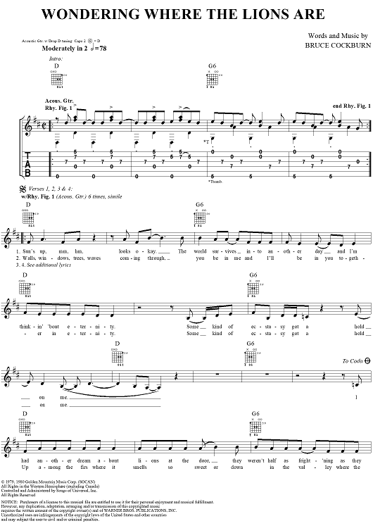 Digital Sheet Music for Wondering Where the Lions Are by Bruce Cockburn scored for Guitar Tab/Vocal; id:292137