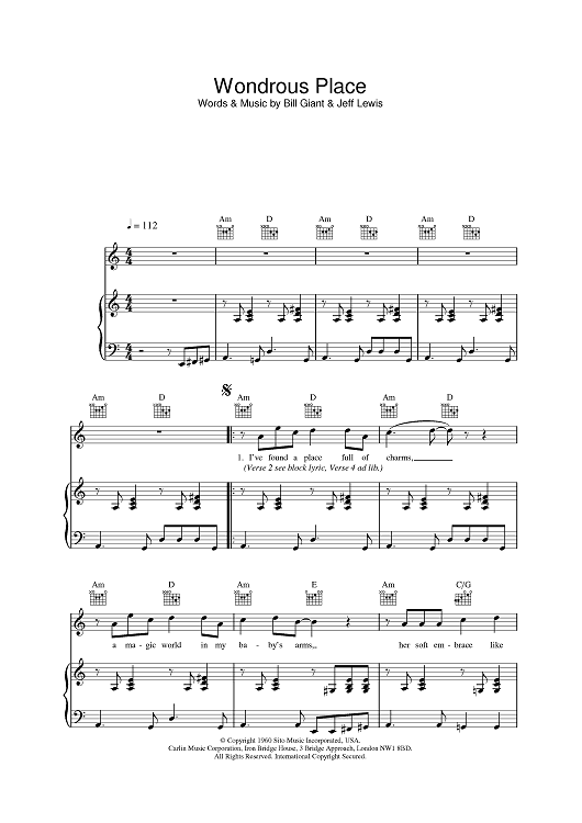 Digital Sheet Music for Wondrous Place by Billy Fury, Bill Giant, Jeff Lewis scored for Piano/Vocal/Chords; id:383897