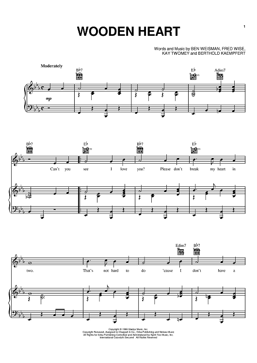 Digital Sheet Music for Wooden Heart by Elvis Presley, Kay Twomey, Fred Wise, Joe Dowell, Berthold Kaempfert, Ben Weisman scored for Piano/Vocal/Chords; id:380321