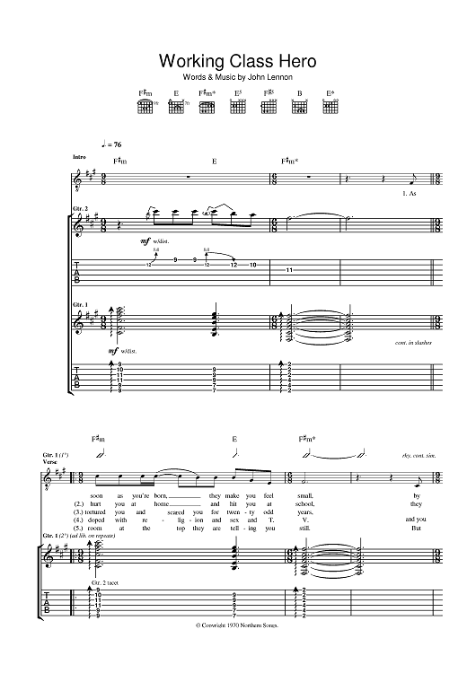 Digital Sheet Music for Working Class Hero by John Lennon, The Manic Street Preachers scored for Guitar Tab; id:401667