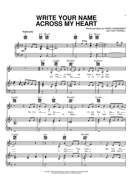 Digital Sheet Music for Write Your Name Across My Heart by Randy Van Warmer, Tony Harrell scored for Piano/Vocal/Chords; id:370189