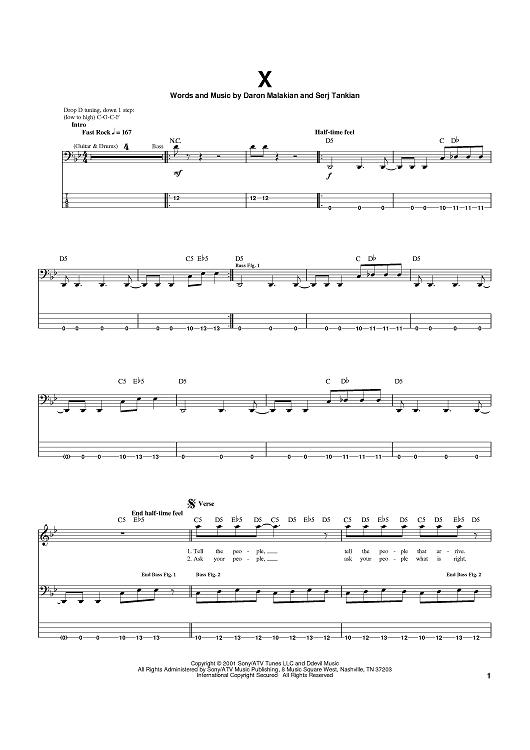 Digital Sheet Music for X by Daron Malakian, System Of A Down, Serj Tankian scored for Bass Tab; id:370425