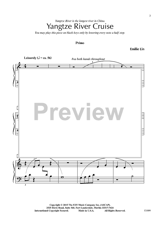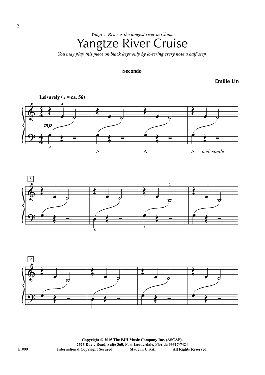 This lovely pentatonic duet can be played on white keys or black keys. It evokes cruising down China's largest river. It's a recital piece that can be learned quickly by young students or adults.