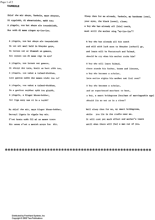 "Yankele - Lyrics" Sheet Music by Mordechai Gebirtig