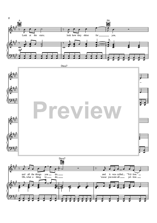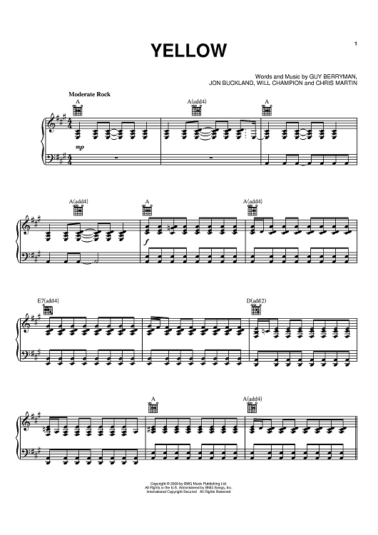 Digital Sheet Music for Yellow by Coldplay, Jonny Buckland, Guy Berryman scored for Piano/Vocal/Chords; id:371817