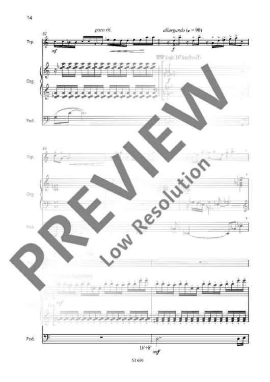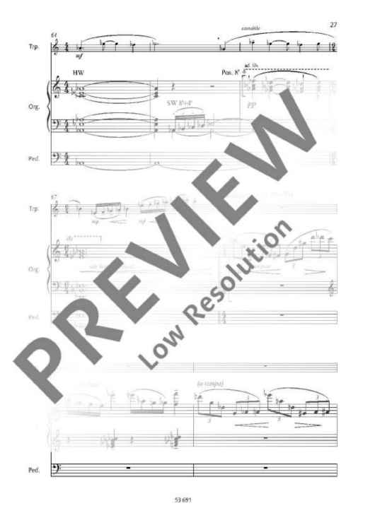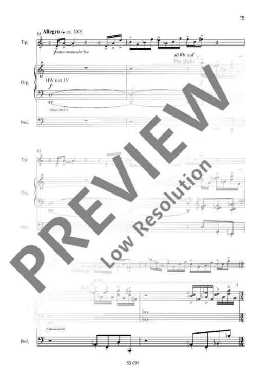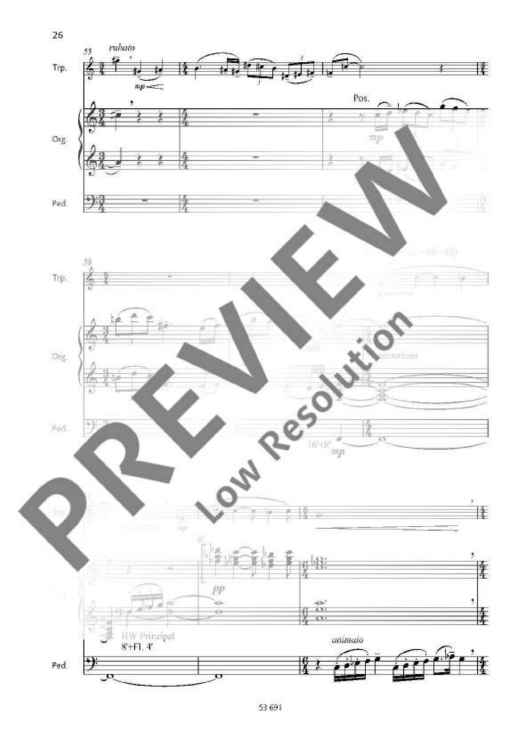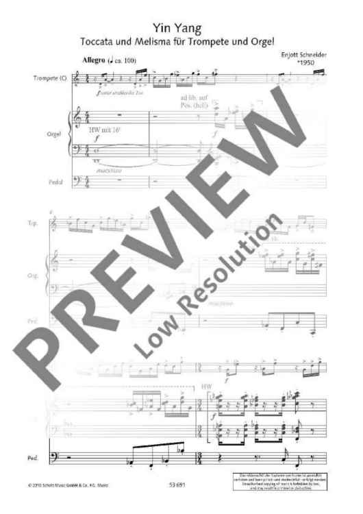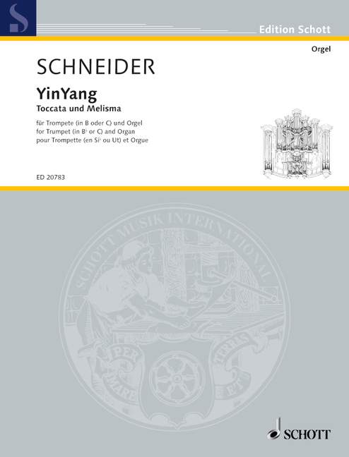 'YinYang' is the union of polar opposites in Taoism. It is the same in the present work for trumpet and organ in which the two movements form a pair of opposites: 'Toccata' is a powerful, solid music piece that is rough around the edges, with staccato as essential form; 'Melisma' is a sweeping, light and round structure with legato as essential form. This polarity is as elementary as 'male and female'. This is why it is characteristic of the yin-yang symbol that the curved, melismatic line unites contrapuntally with the toccata-like rhythm so that a jubilant praise of wholeness – whether in the Christian or Taoist sense – can be heard. (Enjott Schneider)