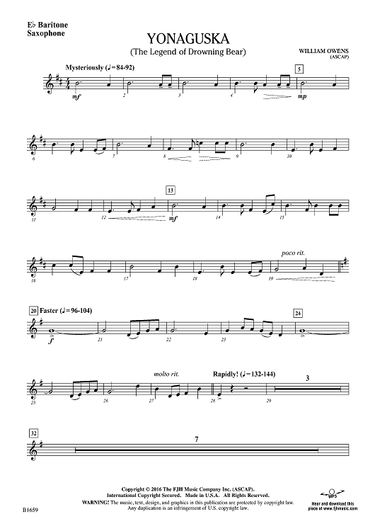 Digital Sheet Music for Yonaguska (The Legend of Drowning Bear) - Eb Baritone Sax by William Owens scored for Concert Band; id:500790
