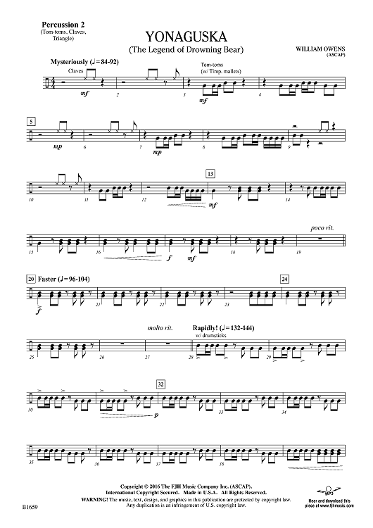 Digital Sheet Music for Yonaguska (The Legend of Drowning Bear) - Percussion 2 by William Owens scored for Concert Band; id:500802