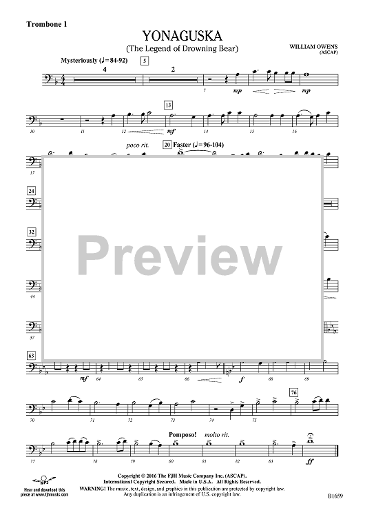 Digital Sheet Music for Yonaguska (The Legend of Drowning Bear) - Trombone 1 by William Owens scored for Concert Band; id:500794