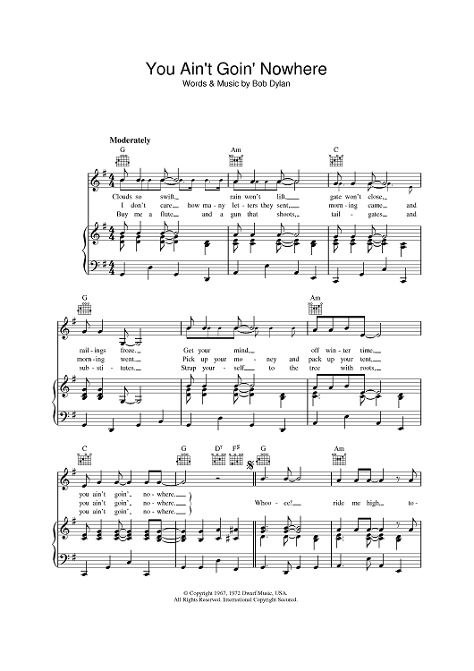 Digital Sheet Music for You Ain't Goin' Nowhere by Bob Dylan scored for Piano/Vocal/Chords; id:389941