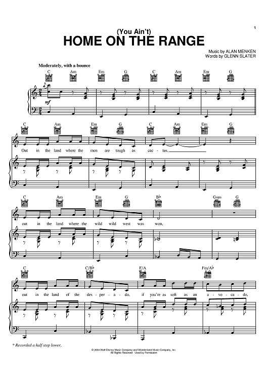 Digital Sheet Music for (You Ain't) Home On The Range - Main Title by Alan Menken, Glenn Slater scored for Piano/Vocal/Chords; id:374536