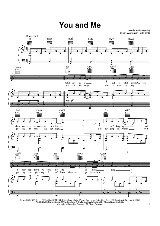 Digital Sheet Music for You And Me by Jude Cole, Jason Wade, Lifehouse scored for Piano/Vocal/Chords; id:383285
