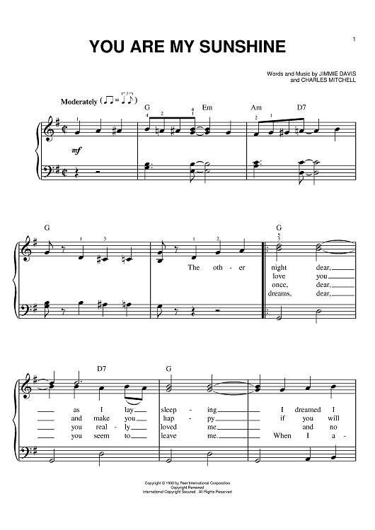 Digital Sheet Music for You Are My Sunshine by Johnny Cash, Duane Eddy, Ray Charles, Charles Mitchell, Jimmie Davis, Norman Blake scored for Easy Piano; id:372403