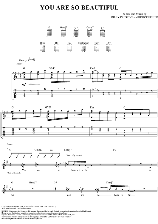 Digital Sheet Music for You Are So Beautiful by Joe Cocker, Billy Preston, Bruce Fisher scored for Guitar Tab/Vocal; id:114068