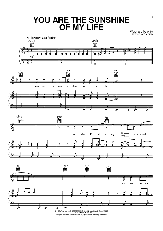 Digital Sheet Music for You Are The Sunshine Of My Life by Stevie Wonder scored for Piano/Vocal/Chords; id:370544