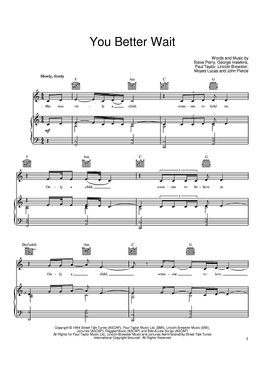 Digital Sheet Music for You Better Wait by Steve Perry, Lincoln Brewster, George Hawkins, Moyes Lucas, John Pierce, Paul Taylor scored for Piano/Vocal/Chords; id:394157