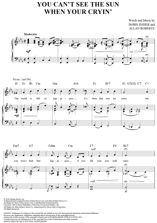 Digital Sheet Music for You Can't See the Sun When Your Cryin' by Allan Roberts, Doris Fisher scored for Piano/Vocal/Chords; id:289758