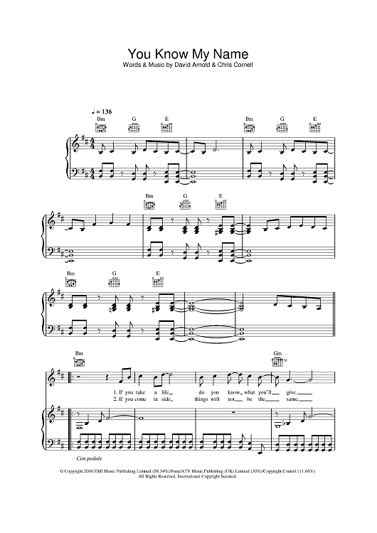 Digital Sheet Music for You Know My Name by David Arnold, Chris Cornell scored for Piano/Vocal/Chords; id:397118