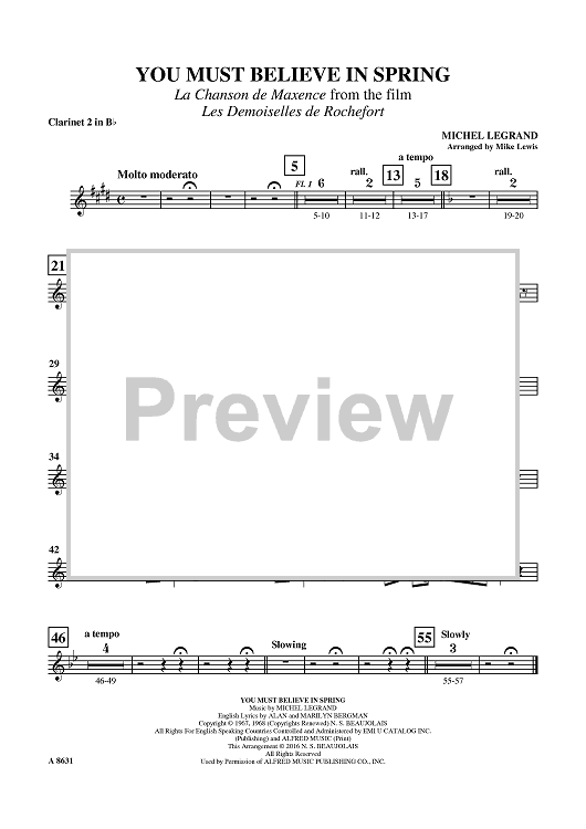 "You Must Believe in Spring - Clarinet 2 in Bb" Sheet Music by Michel LeGrand