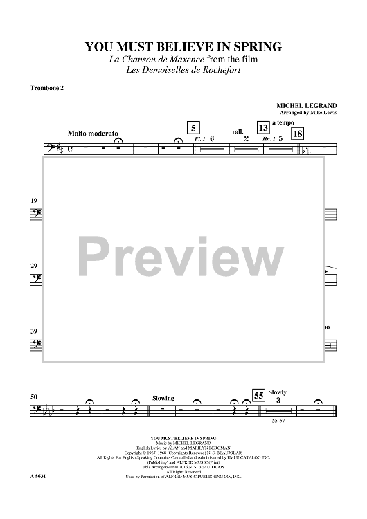 Digital Sheet Music for You Must Believe in Spring - Trombone 2 by Michel LeGrand, Mike Lewis scored for Full Orchestra; id:462344