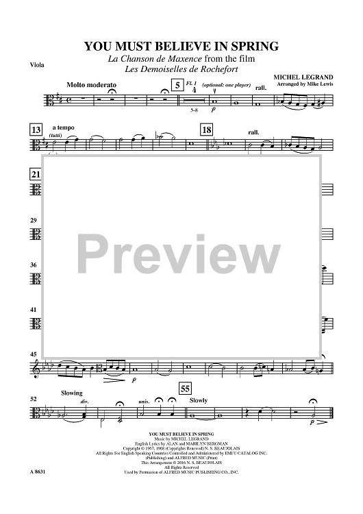 "You Must Believe in Spring - Viola" Sheet Music by Michel LeGrand