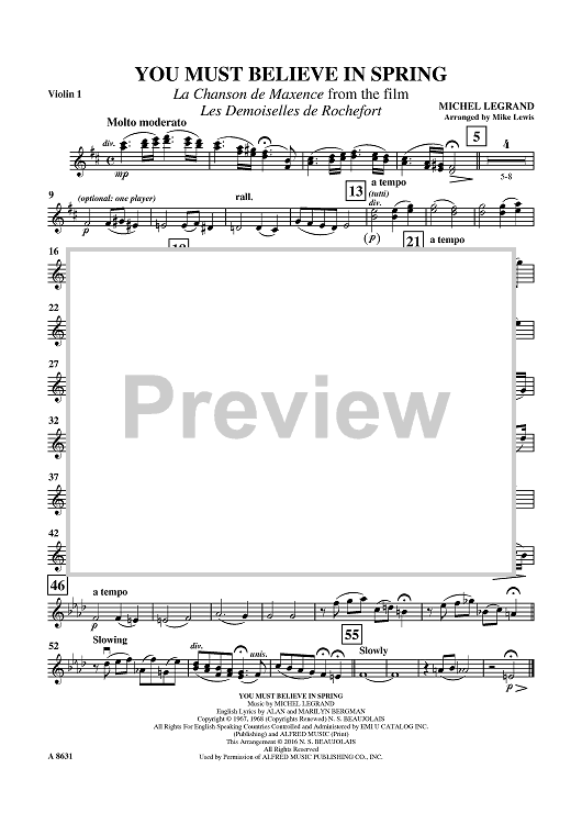 Digital Sheet Music for You Must Believe in Spring - Violin 1 by Michel LeGrand, Mike Lewis scored for Full Orchestra; id:462349