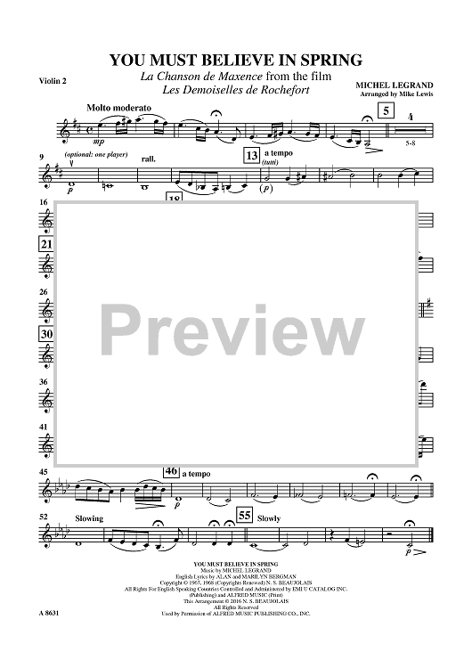 Digital Sheet Music for You Must Believe in Spring - Violin 2 by Michel LeGrand, Mike Lewis scored for Full Orchestra; id:462350