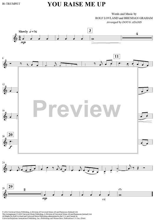 Digital Sheet Music for You Raise Me Up - B-flat Trumpet by Doug Adams, Rolf Lovland, Brendan Graham scored for Concert Band; id:307309