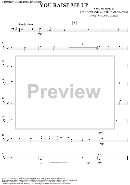 Digital Sheet Music for You Raise Me Up - Trombone/Baritone/Bassoon by Doug Adams, Rolf Lovland, Brendan Graham scored for Concert Band; id:307311