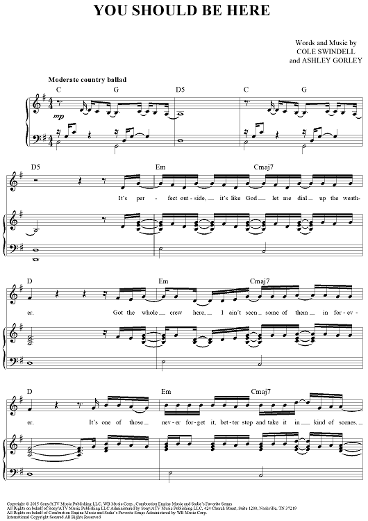 Digital Sheet Music for You Should Be Here by Ashley Gorley, Cole Swindell scored for Piano/Vocal/Chords; id:457572