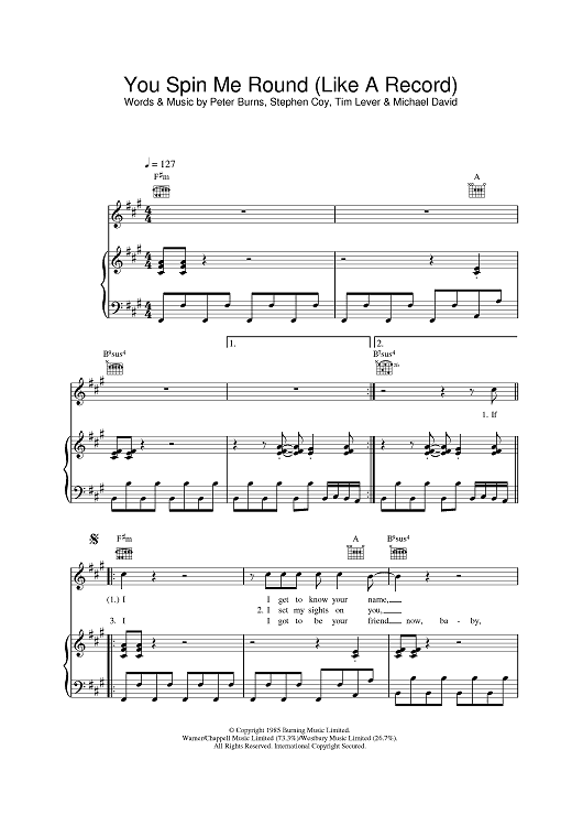 Digital Sheet Music for You Spin Me Round (Like A Record) by Tim Lever, Peter Burns, Stephen Coy, Michael David, Dead Or Alive scored for Piano/Vocal/Chords; id:396827