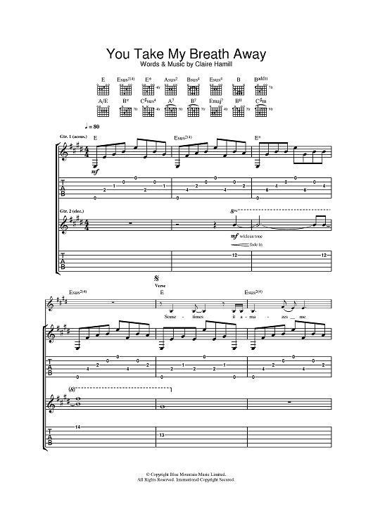 Digital Sheet Music for You Take My Breath Away by Eva Cassidy, Claire Hammill scored for Guitar Tab; id:380194