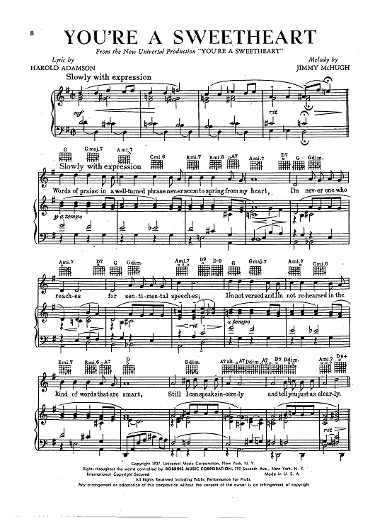 Digital Sheet Music for You're A Sweetheart by Jimmy McHugh, Harold Adamson, Barry Wood scored for Piano/Vocal/Chords; id:423037