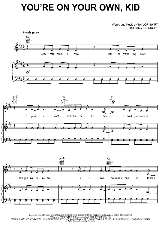 Digital Sheet Music for You're On Your Own, Kid by Taylor Swift, Jack Antonoff scored for Piano/Vocal/Chords; id:498174