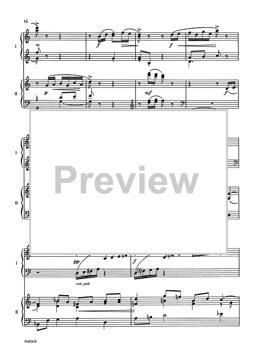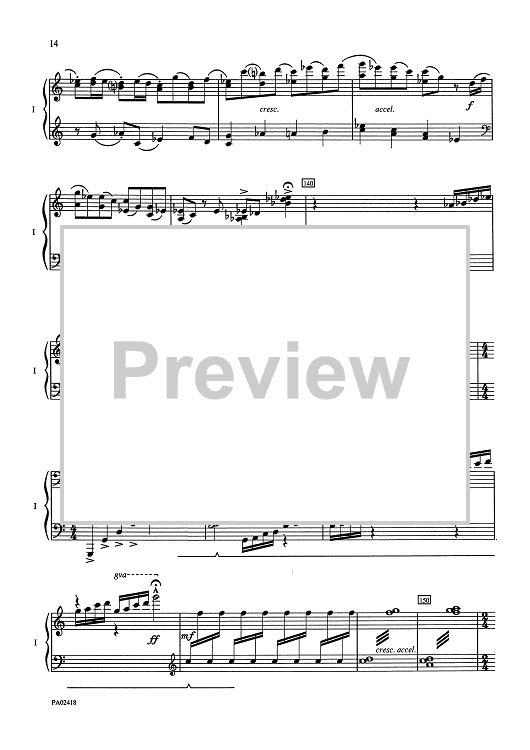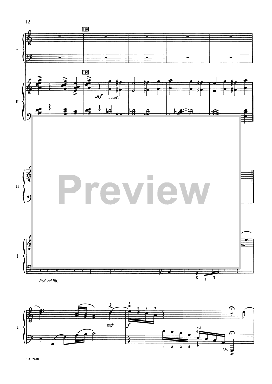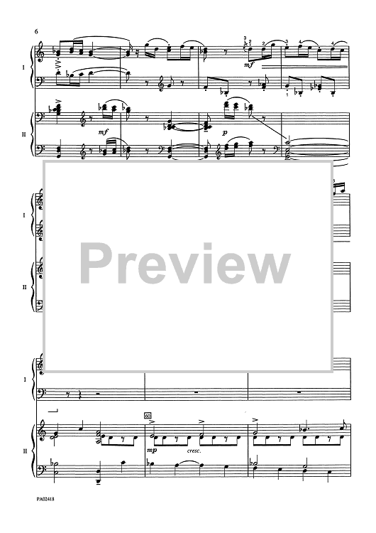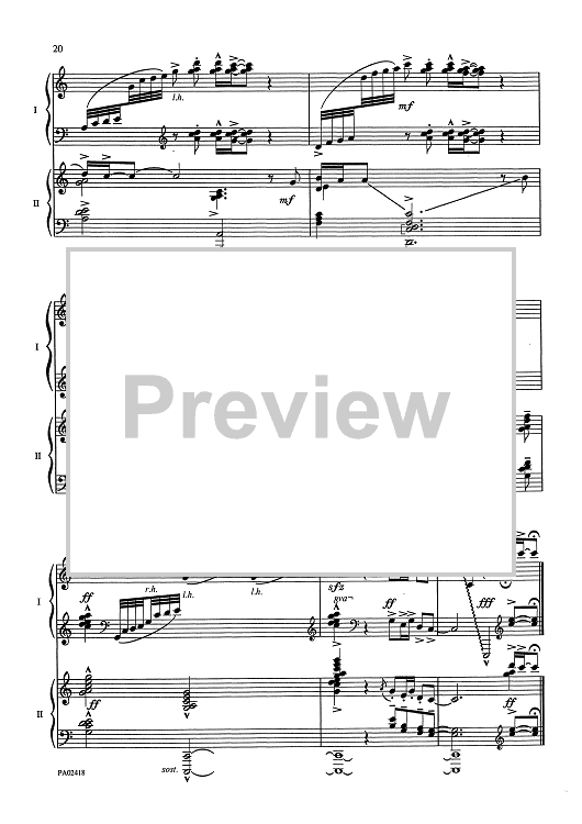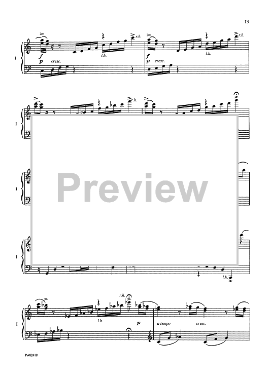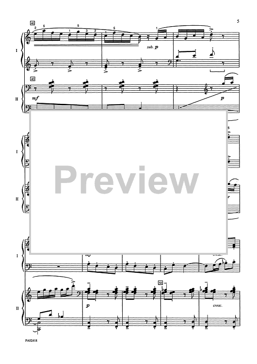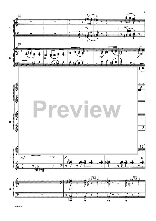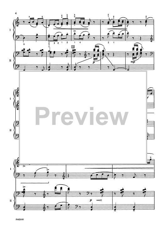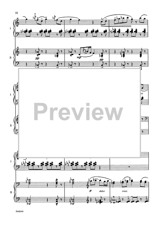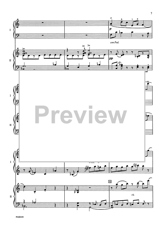 A fine concerto for intermediate level pianists. This work (duration approx. 9 min.) is exciting for performer and audience. The melodic theme allows thoughtful musicianship, and the cadenza gives good opportunity for accessible showmanship. The second piano part is also satisfying for the player.