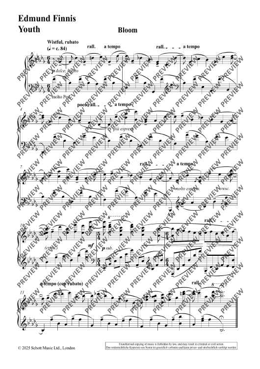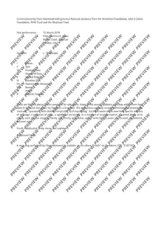 These are the first pieces I have composed for solo piano. Many of the sounds, patterns and ideas within them have been in my mind and under my hands for a long time. The brief pieces variously include performance directions like ‘intimate’, ‘spacious’, ‘with childlike simplicity’, ‘as if improvising’. Each one seems to me now like a specific memory of an image, a sensation of place, a significant encounter, or a moment of vivid perception. I wanted above all to convey each musical image as clearly and directly as possible, and to write for the piano in a focused, uncluttered, personal way. Youth is dedicated to my nieces and nephews. © Edmund Finnis