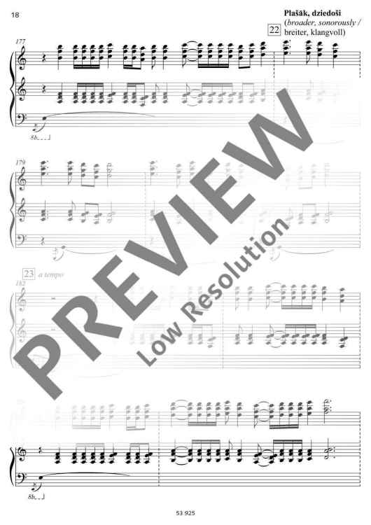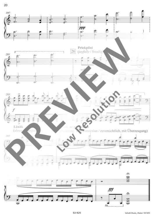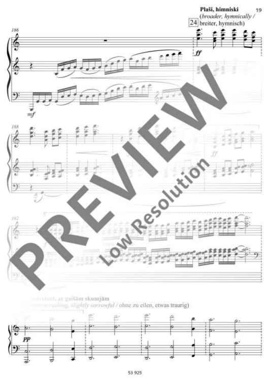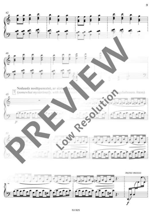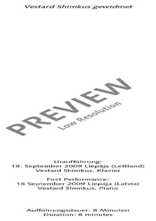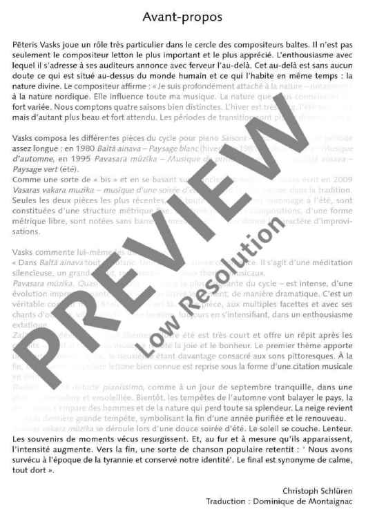 Zala ainava (Green Landscape) is the final part of the cycle Die Jahreszeiten (The Seasons), a collection for piano with the pieces Rudens muzika (Autumn Music), Balta ainava (White Landscape) and Pavasara muzika (Spring Music). Nature in all its forms and the relation of man to nature play a major role in Peteris Vasks' music. The sound spectrum in Zala ainava ranges from soft pianissimo to eruptive chord clusters. Thus, acoustic images describing nature in summer are created within the listener. For the widely noticed world premiere of the entire cycle by the Latvian pianist Vestard Shimkus, Vasks composed an encore, Vasaras vakara muzika, which can also be performed alone - evocative music for a mild summer evening.