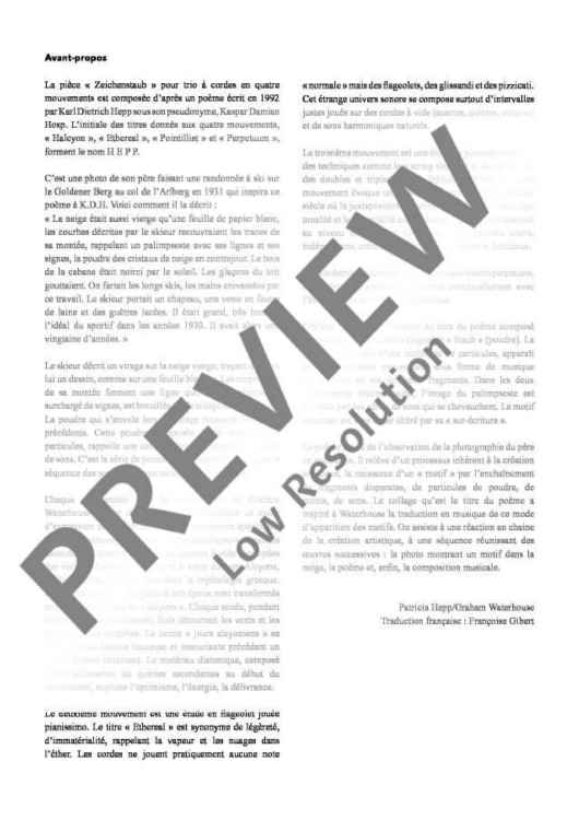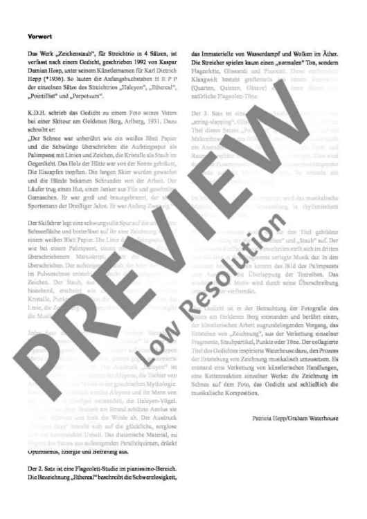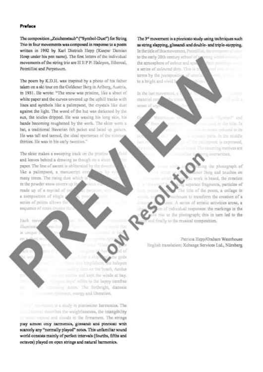 The composition was composed in response to a poem written in 1992 by Karl Dietrich Hepp (Kaspar Damian Hosp under his pen name). The first letters of the individual movements of the string trio are H E P P: Halcyon, Ethereal, Pointillist and Perpetuum. The poem by K.D.H. was inspired by a photo of his father taken on a ski tour in 1931. Both, the poem and the photo are printed in the edition and everything adds up to a fascinating, artistic chain reaction. The diatonic material of the first movement in the composition by Waterhouse expresses optimism, energy and liberation. The 2nd movement is a study in pianissimo harmonics. The following 3rd movement is a pizzicato study in a bright and vivid harmonic tableau. In the last movement, a kind of Moto Perpetuo, the musical material continually transforms. Graham Waterhouse (*1962) was born into a musical family and has lived in Munich since 1992 where he is active as a freelance composer and cellist. He received his musical education at Cambridge University and at music colleges in Essen and Cologne. His works to date comprise mainly chamber music and instrumental concerts. Waterhouse performs as a solo cellist and in various chamber music formations. He has performed his own Cello Concerto in Toluca, Mexico City, Gorkij, Weimar and Baden-Baden.