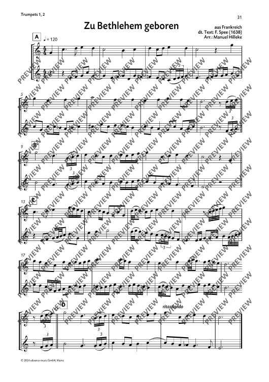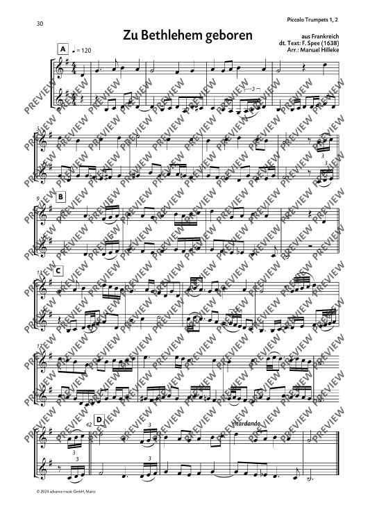 Digital Sheet Music for Zu Bethlehem geboren by Manuel Hilleke scored for 2 Trumpets Or 2 Piccolo Trumpets; id:510878
