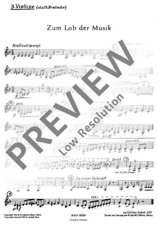 "Zum Lob der Musik - Violin Iii" Sheet Music by Joseph Haas