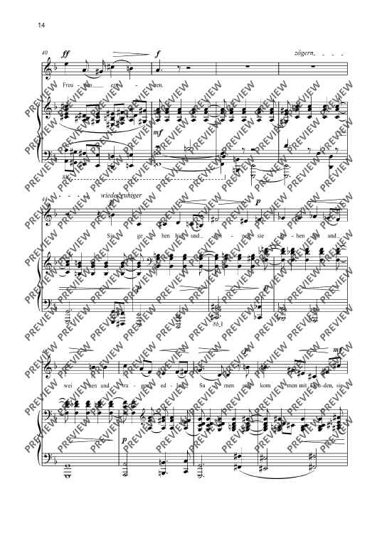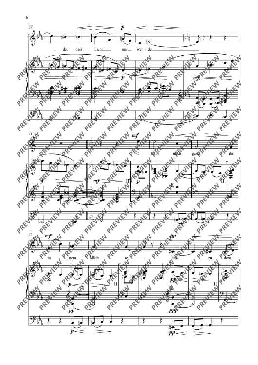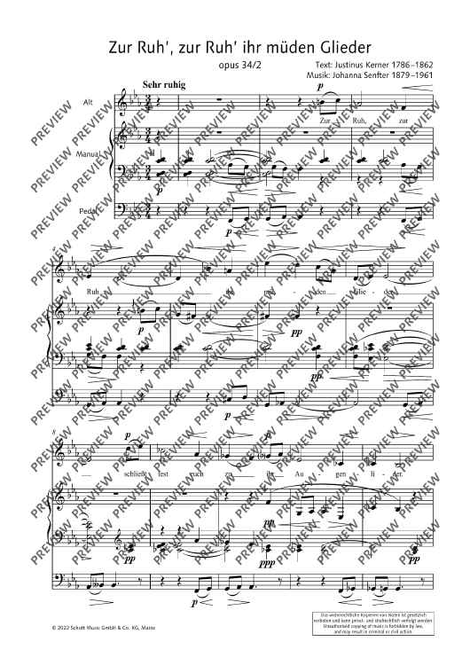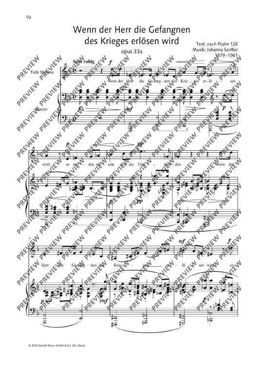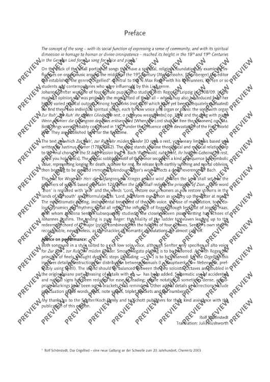 In dem umfangreiche Oeuvre der Oppenheimer Komponistin Johanna Senfter finden sich lediglich zwei geistliche Solo-Lieder. Beide wohl 1917 komponierten Lieder stehen unter dem Eindruck der Katastrophe des 1. Weltkrieges. Sie werden hiermit als Erstveröffentlichung vorgelegt. JOHANNA SENFTER 1879 – 1961 In Oppenheim/Rhein geboren und aufgewachsen – Erster Unterricht durch die Mutter (Klavier, Violine) – Schul- und Studienjahre in Frankfurt/Main – Ab 1895 paralleles Musikstudium am Hoch‘schen Konservatorium Frankfurt, Abschluss 1903 (Klavier, Orgel, Violine, Kompostion; besonders Auseinandersetzung mit J.S. Bach) – Ab 1907 Privatunterricht bei Max Reger – Oktober 1908 bis 1909 seine Studentin am Leipziger Konservatorium – 1909 Arthur-Nikisch-Preis für die beste Komposition – Danach in Oppenheim als freie Komponistin und Musiklehrerin tätig – Freundschaftliches Verhältnis der Familien Reger und Senfter – Mit Regers Tod 1916 verlor sie den Protegé für die Werbung ihrer Werke (ca. 130) –¬ 1921 Gründung zweier Musikvereine ROLF SCHÖNSTEDT 1944 in Erfurt/Thüringen geboren – Studium der Kirchenmusik in Herford und Köln – Kirchenmusikalische Examina (B / A / Künstlerische Reifeprüfung / Konzertexamen) – Kantorenstellen in Remscheid, Wuppertal, Hamm/Westf. – KMD, Landesobmann der Kirchenmusiker, Landeskirchenmusikdirektor, Dozent an der Westf. Landeskirchenmusikschule Herford – 1975 Künstlerischer Leiter des „Internationalen Reger-Festivals“ in Hamm – 1993/4 Rektor der Hochschule für Kirchenmusik Herford – Orgelprofessur, Dr. phil. („Das Orgellied – eine neue Gattung an der Schwelle zum 20.Jahrhundert“) – Als Organist, Cembalist, Dirigent, Referent tätig in Europa, Russland, Nord- und Südamerika, Afrika – Mitbegründer des 2. „Reger-Festes“ in Argentinien – Vorstand der „Internationalen Max-Reger-Gesellschaft“ – Mitglied der argentinischen Nationalakademie für Kunst und Musik – Ehrungen und Auszeichnungen (national / international) – Herausgeber: Reihe „Das Geistliche Lied“ /
