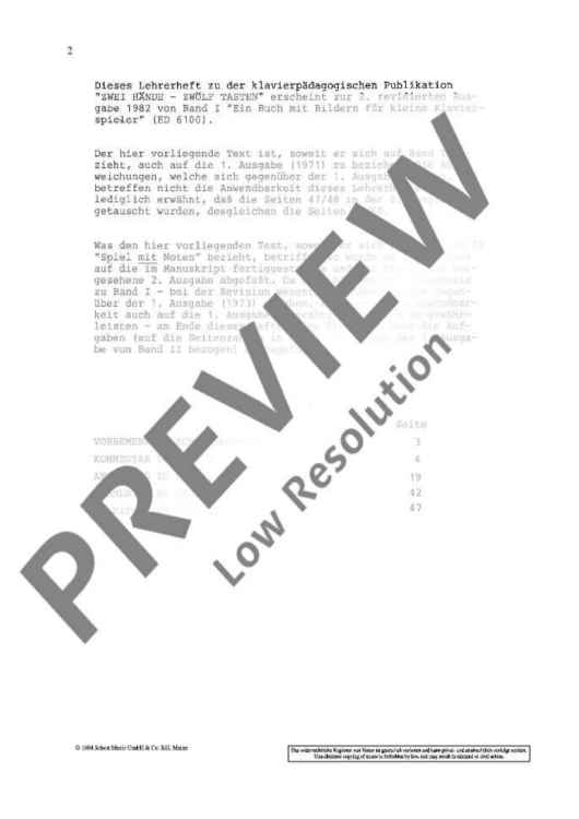 Dieses Lehrerheft zu der klavierpädagogischen Publikation "Zwei Hände - Zwölf Tasten" erscheint zur 2. revidierten Ausgabe 1982 von Band I "Ein Buch mit Bildern für kleine Klavierspieler" (ED 6100). Der hier vorliegende Text ist, soweit er sich auf Band I bezieht, auch auf die 1. Ausgabe (1971) zu beziehen. Die Abweichungen, welche sich gegenüber der 1. Ausgabe ergaben, betreffen nicht die Anwendbarkeit dieses Lehrerheftes. Es sei lediglich erwähnt, dass die Seiten 47/48 in der 2. Seite ausgetauscht wurden, desgleichen die Seiten 59/60. Was den hier vorliegenden Text, soweit er sich auf den Band II "Spiel mit Noten" bezieht, betrifft, so wurde er im Hinblick auf die im Manuskript fertiggestellte und zur Produktion vorgesehene 2. Ausgabe abgefasst. Da sich hierbei - im Gegensatz zu Band I - bei der Revision wesentliche Abweichungen gegenüber der 1. Ausgabe (1973) ergaben, wurde - um die Anwendbarkeit auch auf die 1. Ausgabe in praktikabler Form zu gewährleisten - am Ende dieses Heftes eine Übersicht über die Aufgaben (auf die Seitenzahlen in der 2. bzw. auch der 1. Ausgabe von Band II bezogen) hinzugefügt.