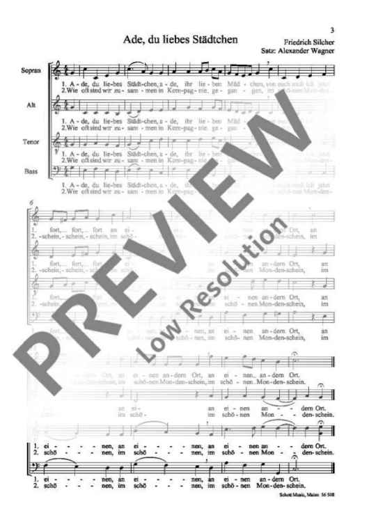 Wer einfache, aber dennoch niveauvolle Volksliedliteratur für gemischten Chor sucht, ist bei Alexander Wagner an der richtigen Adresse. Mit der Frühlingsbotschaft Leise zieht durch mein Gemüt auf einen Text von Heinrich Heine und dem Abschiedslied des Handwerksgesellen Ade, du liebes Städtchen von Friedrich Silcher liegen in dieser Ausgabe gleich zwei beliebte und allseits bekannte Volkslieder vor, die der deutsche Komponist, Chorpädagoge und Chordirigent für vierstimmigen gemischten Chor (SATB) a cappella gesetzt hat. Beide jeweils zweistrophigen Sätze sind aufgrund ihrer schlichten Schönheit, einfachen Intervallschritte und eingängigen Melodik bzw. Harmonik für jeden gemischten Laienchor ausgezeichnet handhabbar und bieten sich auch als leicht auswendig zu lernende spontane Ständchen bestens an.